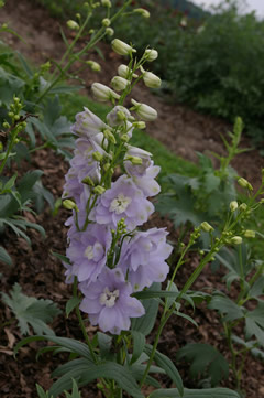 Could not tell difference between 'Candle Violet' and 'Candle Lavender'; Seeded in flats on 1/25 and gave 2 weeks of cold treatment. First harvest, 7/4 - 7/15, then a new flush 9/15 - 10/20; I could sell all the delphiniums I could grow, but have powdery mildew issues which affect the blooms not just foliage; General comments on trial (Zone 5): Plants were transplanted unto shallow beds covered with plastic mulch and with trickle irrigation, there were 2 replications in a high tunnel, and 2 outside, plants were arranged in a 12 x 12 inch spacing in 3 rows on each bed. Plant death due to root disease was the dominant feature of this trial, with the exception of the Bellamosum types, all other varieties were essentially dead by early September, the unusually warm growing season may have contributed to this mortality.